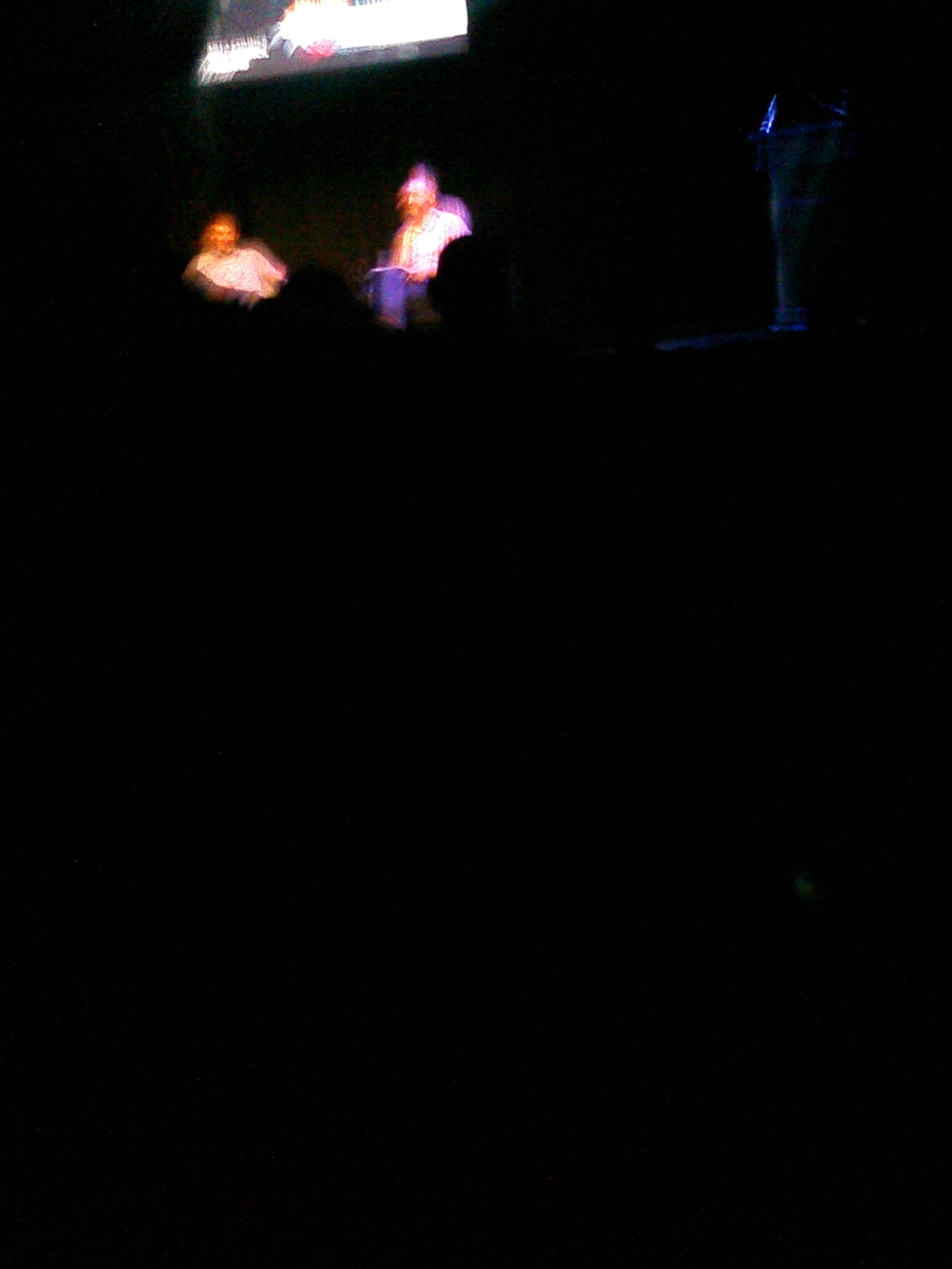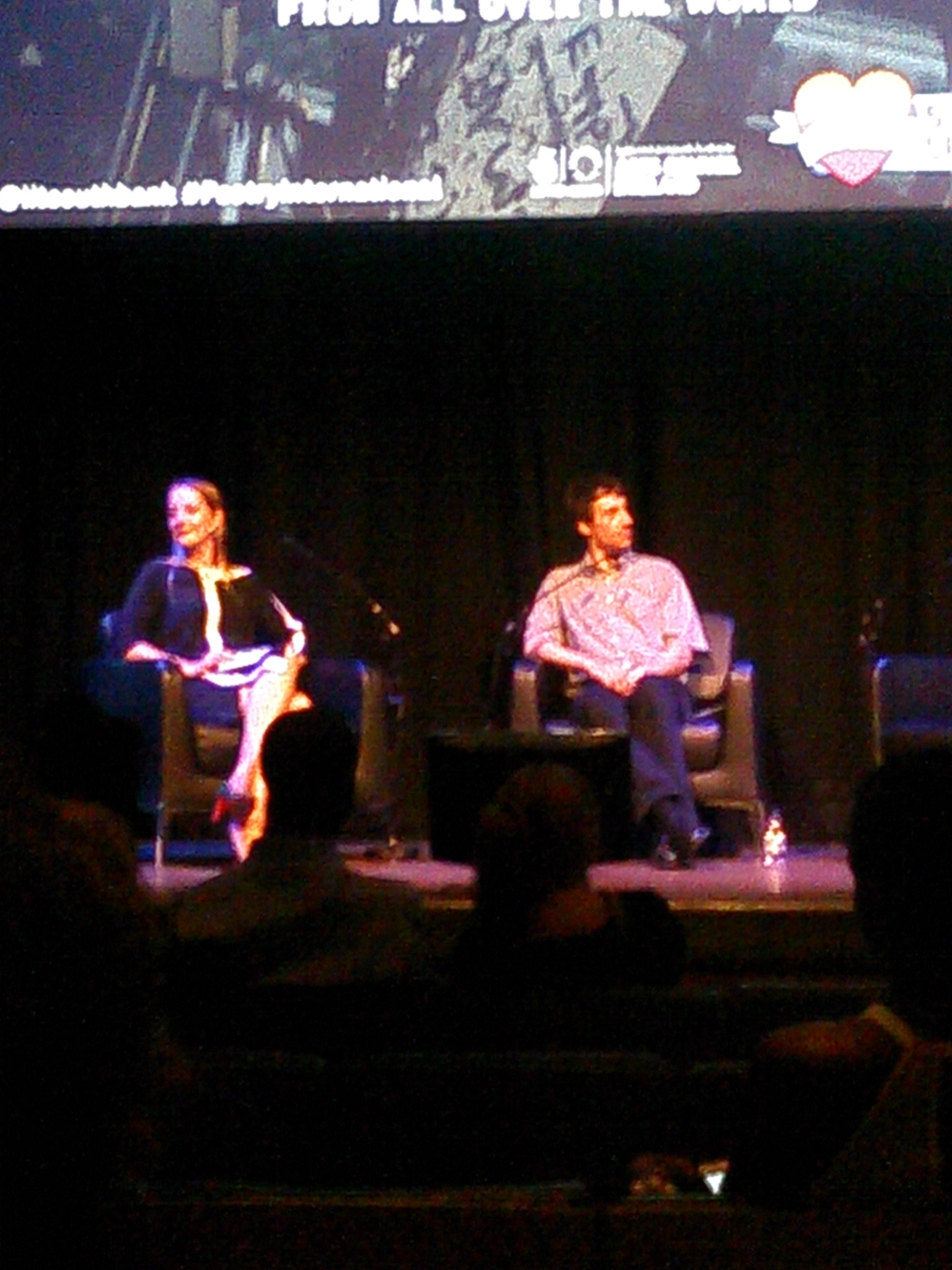 Judges Malgorzata Kitowski and Thomas Zandegiacomo Del Bel on stage in the Purcell Room at the Southbank Centre.