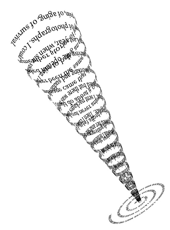 A navigational poem that presents the viewer with the image of a three-dimensional spiral jetting off the center of a two-dimensional spiral. Both spirals are made exclusively of text. The reader is able to grab and spin this cosmic verbal image in all directions. Thus, reading becomes a process of probing the virtual object from all possible angles. The reader is also able to fly through and around the object, thus expanding reading possibilities. In “Letter” a spiraling cone made of words can be interpreted as both converging to or diverging from the flat one. Together they may evoke the creation or destruction of a star. All texts are created as if they were fragments of letters written to the same person. However, in order to convey a particular emotional sphere, the author conflated the subject positions of grandmother, mother, and daughter into one addressee. It is not possible to distinguish to whom each fragment is addressed. The poem makes reference to moments of death and birth in the poet’s family. Letter is presented here as video documentation of an interactive reading experience. – EK