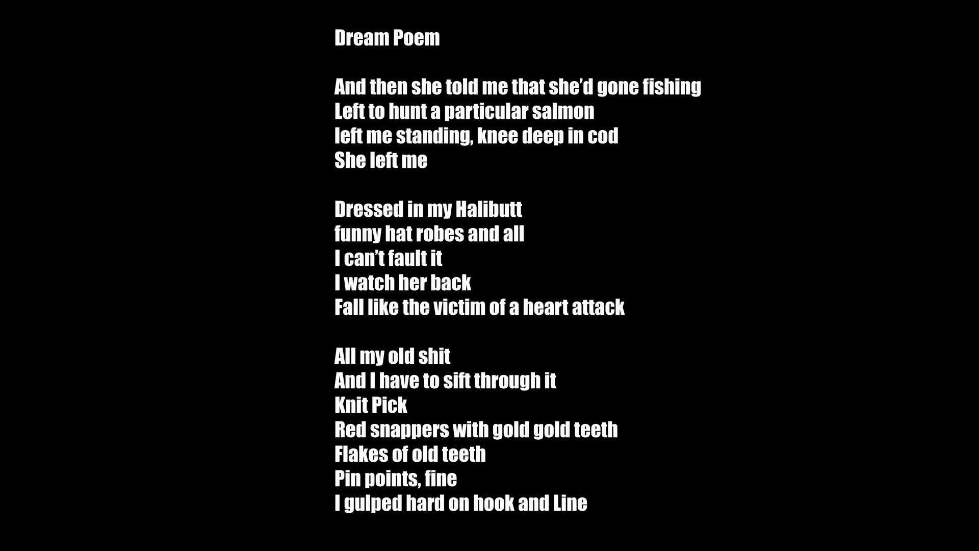 “In dreams it’s impossible to read the same thing twice and not have it change on you. In 2006 I made this poem from the perspective of someone who is having a fitful night’s sleep and is worried about their relationship, about loneliness, about death. The film was once played for the Sultan of Brunei, whose daughter is dyslexic. He actually sent me a sword to say thank you. It was all very strange. I still love it dearly, so I hope you enjoy it as much as the Sultan did. Please don’t send me any more swords.” – Dann Casswell