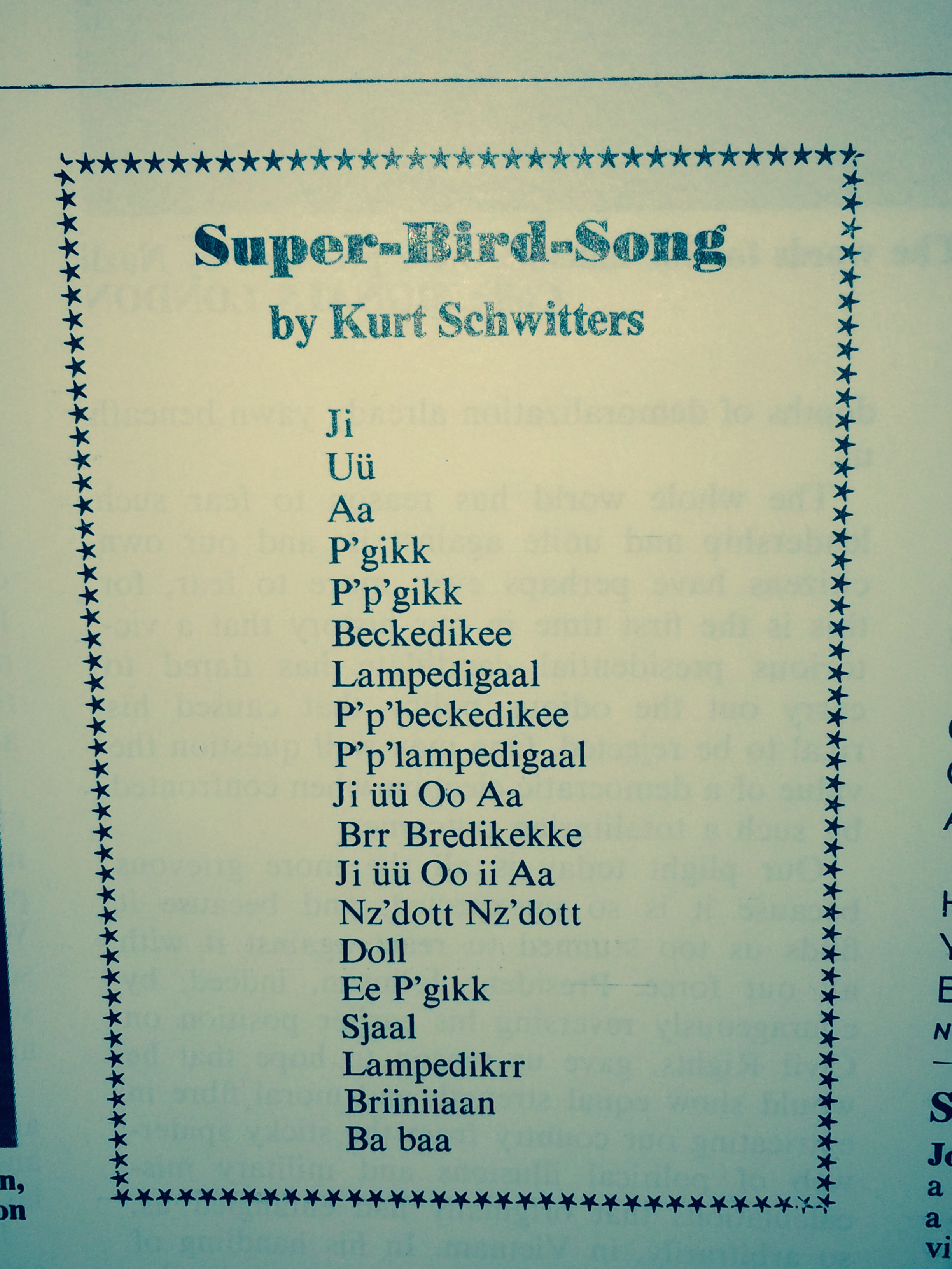 “By emphasizing again the sound value of poetry, words in their printed form will not have any meaning that people need to labor over deciphering. Consonants will become empty, purely auditory, simple lines having physical meaning only in the listener’s ears. By placing value on effects beyond their usual meaning (in words), poetry will create a new sensitivity. In the place of the cerebral beauty that was created in the chiseling style of poetry, one responds simply with direct auditory understanding. It is then a matter of discovering the unknown abundance of purely oral constructions; of untangling the intangible accents in vocabulary. Poetry is thus liberated from all prose (reading for meaning without regard for tones), to become an instrument of lyrical communication. Poetry realizes its mission which is precisely to broadcast local imperceptibilities and applied suggestions, because poetry was created by individuals who wanted to understand each other, sensing the linguistic vibrations against their palates. Verse is the result of a need to consider the phonetic effects produced in other people’s imaginations. Letterism intends to introduce this beauty, which is limited in the present system of oral communication by lack of rules and even of letters. This is why it is necessary to regulate the stability of auditory frequencies by constructing elements specially designed for the purpose. It is a matter of enriching the possibilities for denoting the changes that occur between sound values. These particles of language, still inferior and unexpressed, must acquire proper signs so that they can develop in their own category, the auditory.”